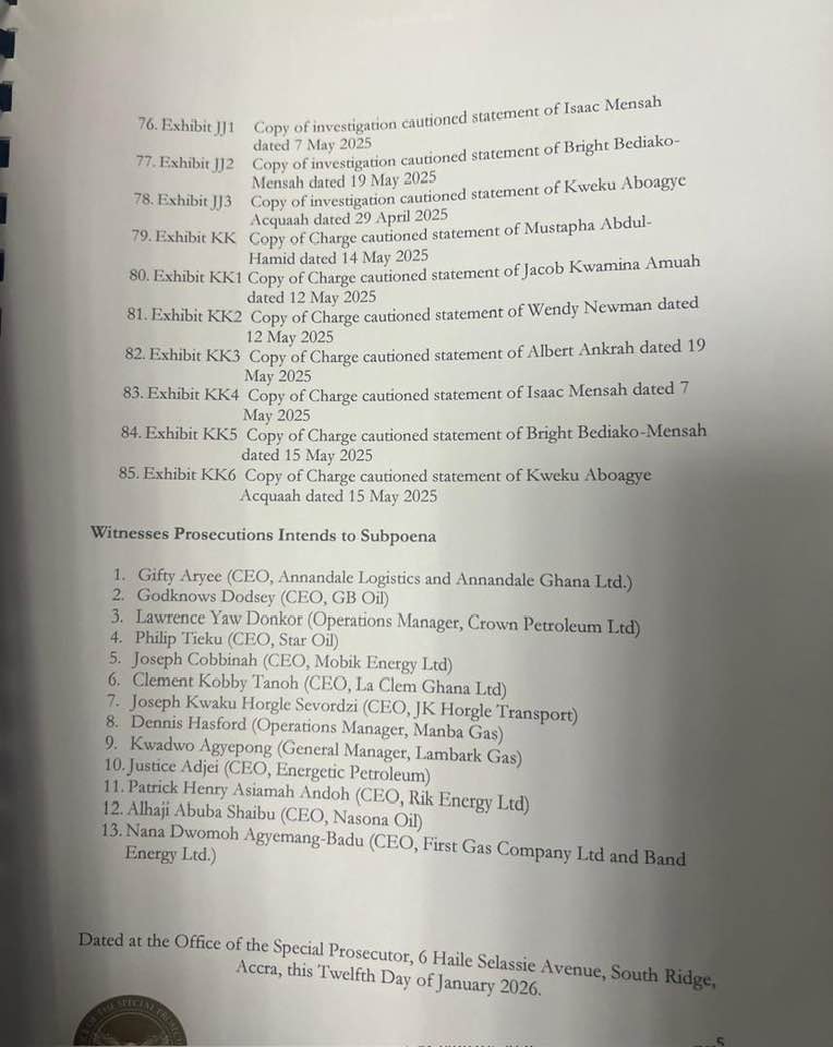 The document, dated January 12, 2026, and issued from the Office of the Special Prosecutor at South Ridge, Accra, lists a series of exhibits and names of individuals described as witnesses the prosecution plans to compel to testify. The witnesses include chief executives and senior managers of several oil marketing and energy companies operating in Ghana.